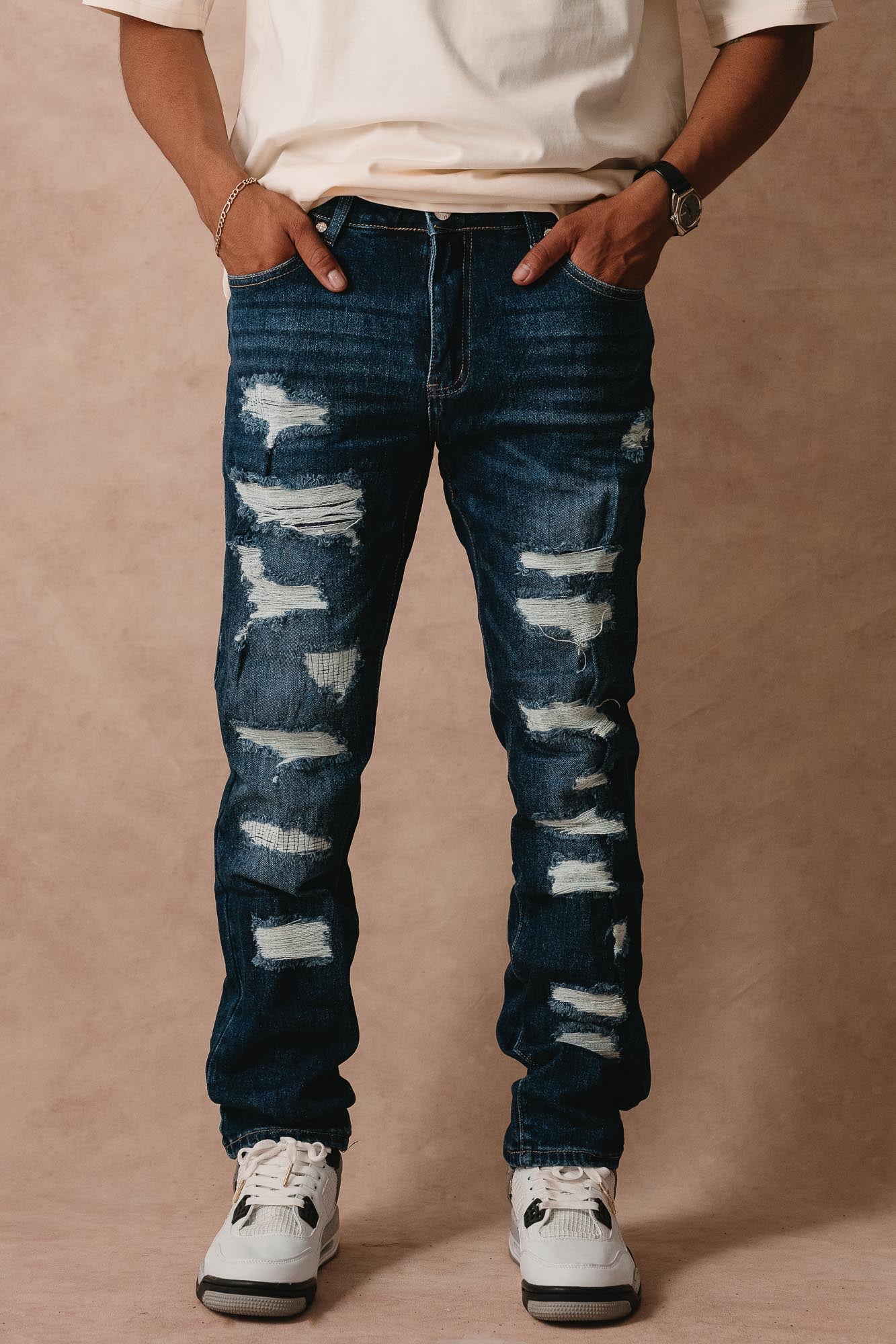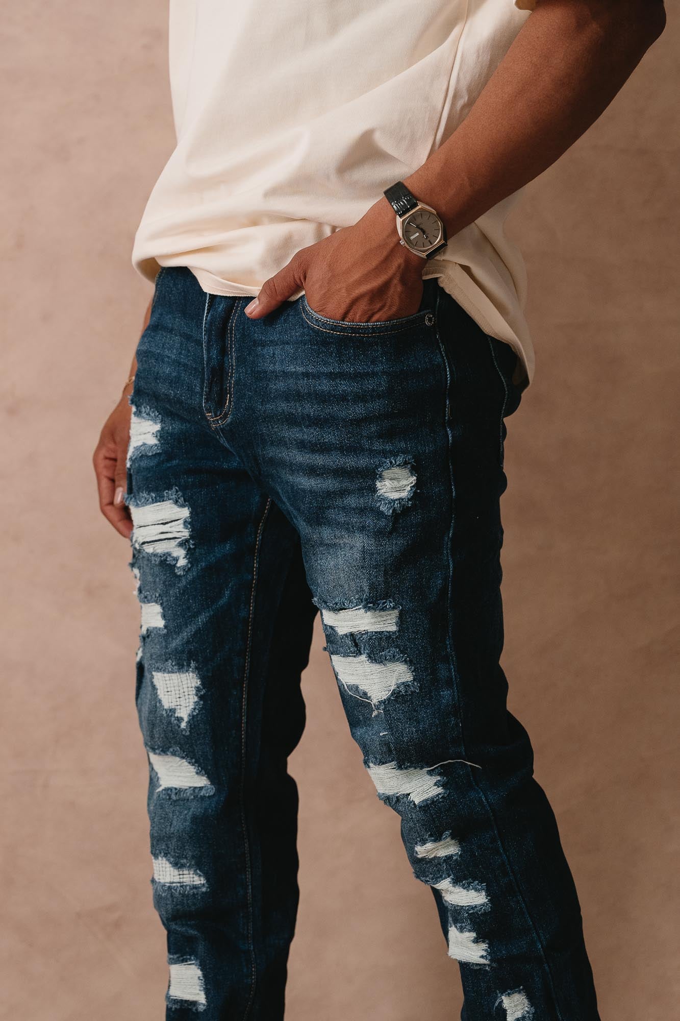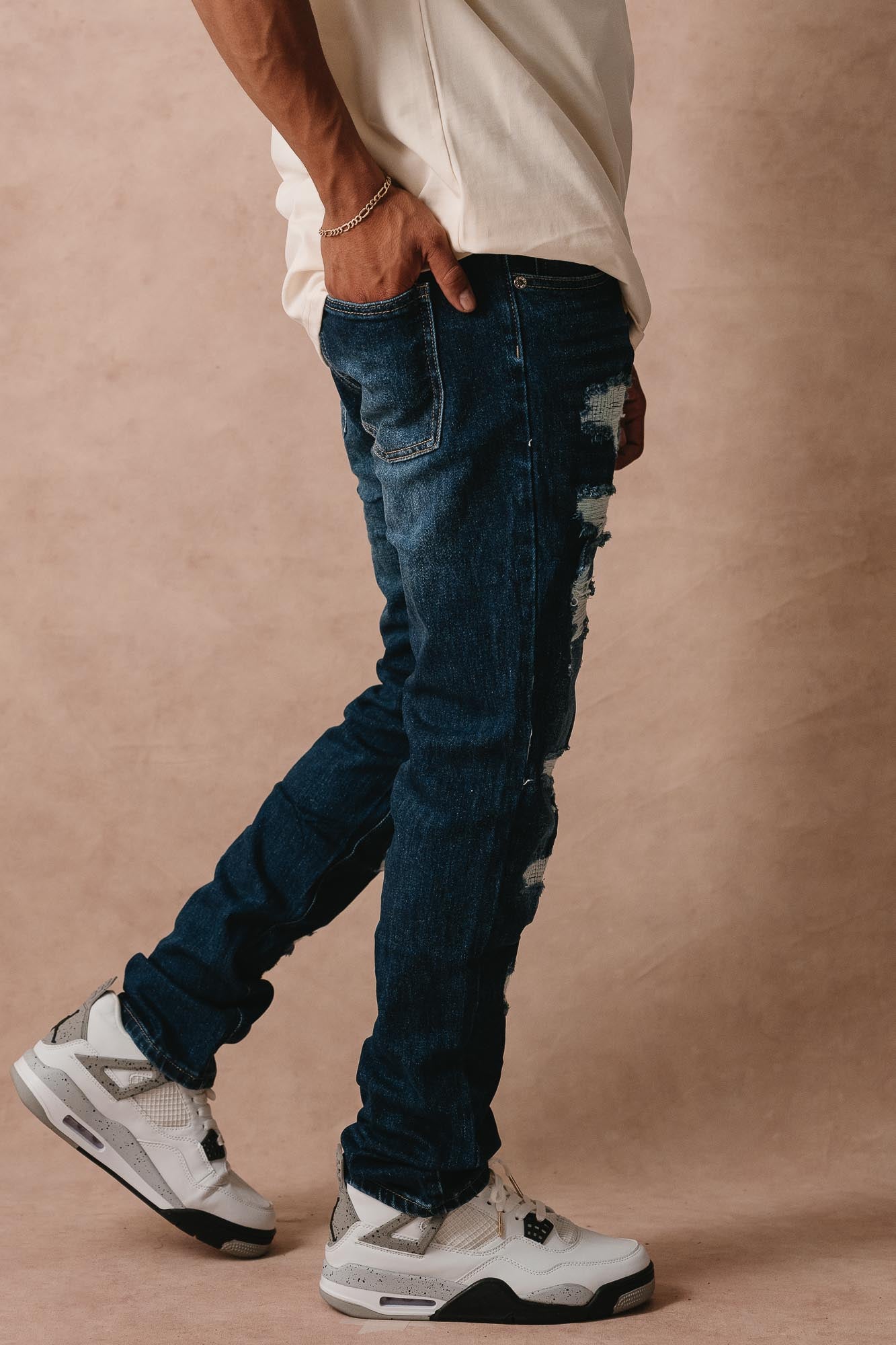 Jeans de 14 onzas en mezclilla resistente con diseño rasgado y parche distintivo. Perfecto para un look urbano y auténtico que destaca en cualquier ocasión. Comodidad y estilo streetwear en una sola prenda.
