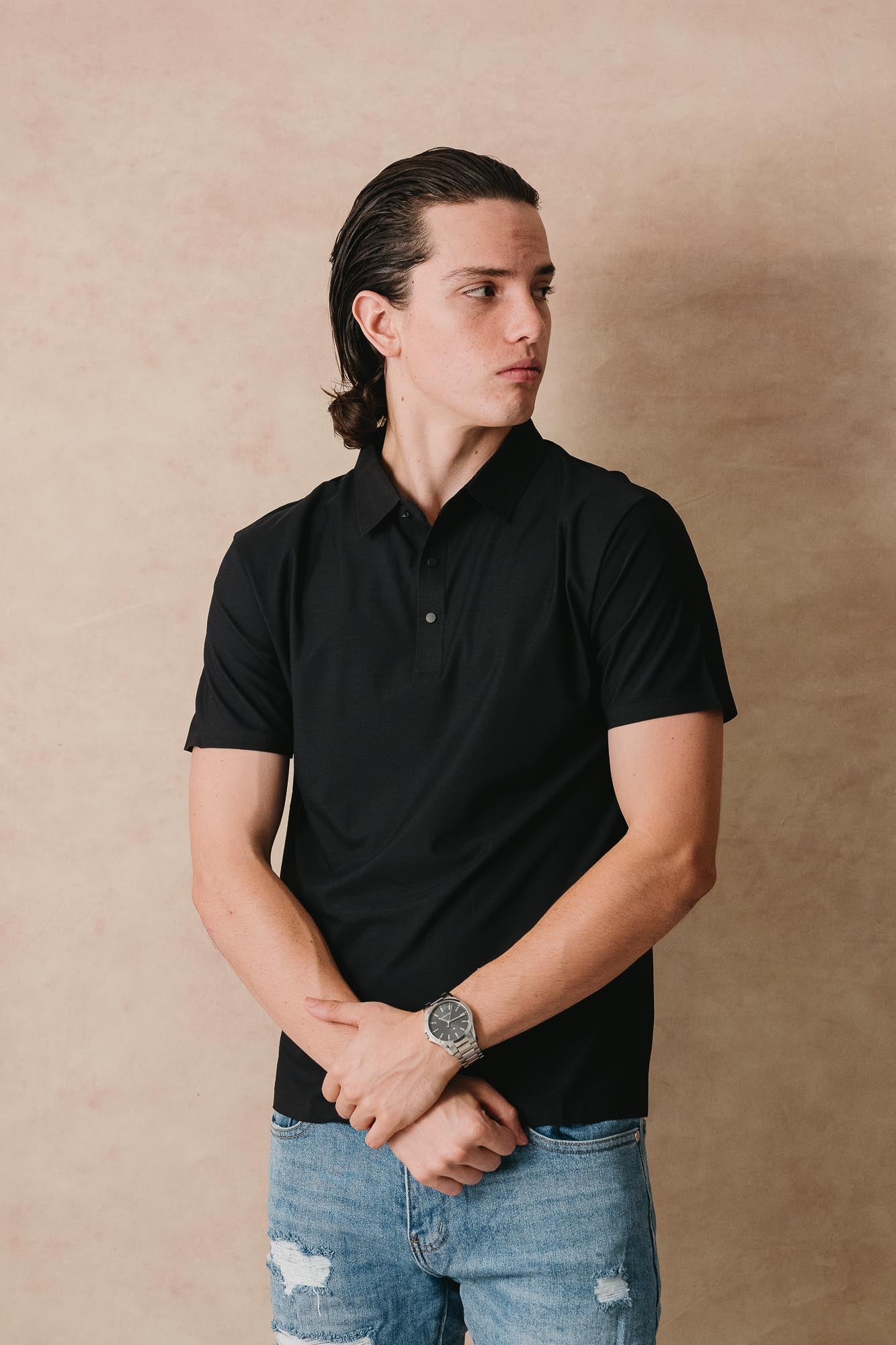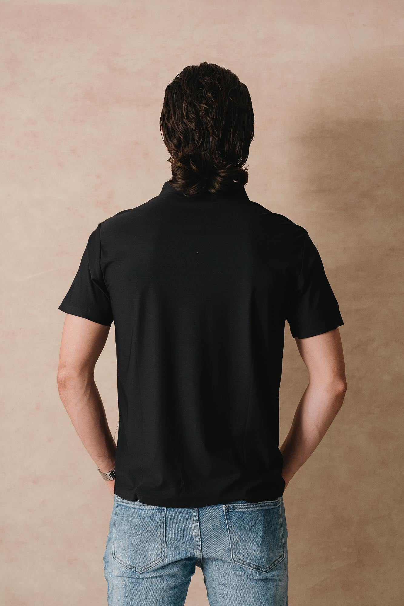 Polo de seda de hielo con corte regular que combina comodidad y estilo. Tela fresca y suave ideal para climas cálidos, con un ajuste clásico que favorece cualquier tipo de cuerpo. Perfecto para looks casuales o semi-formales. Disponible en negro, una opción versátil que va con todo tu guardarropa.